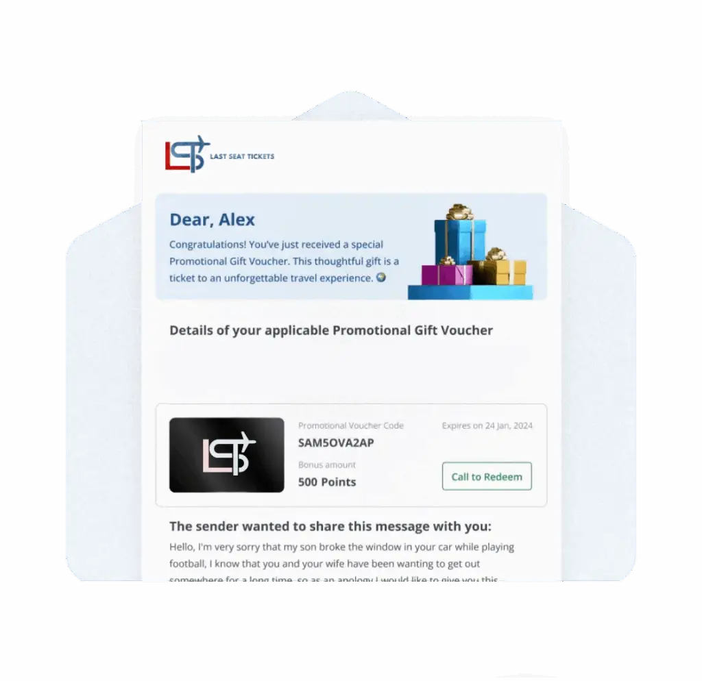 Remember, every dollar spent on this product will be converted into a loyalty bonus for the recipient. The recipient will receive our promotional voucher in loyalty points equivalent to the amount you paid for the product, which can be redeemed in connection with their purchase at LastSeatTickets, plus concierge service for a superior travel experience.